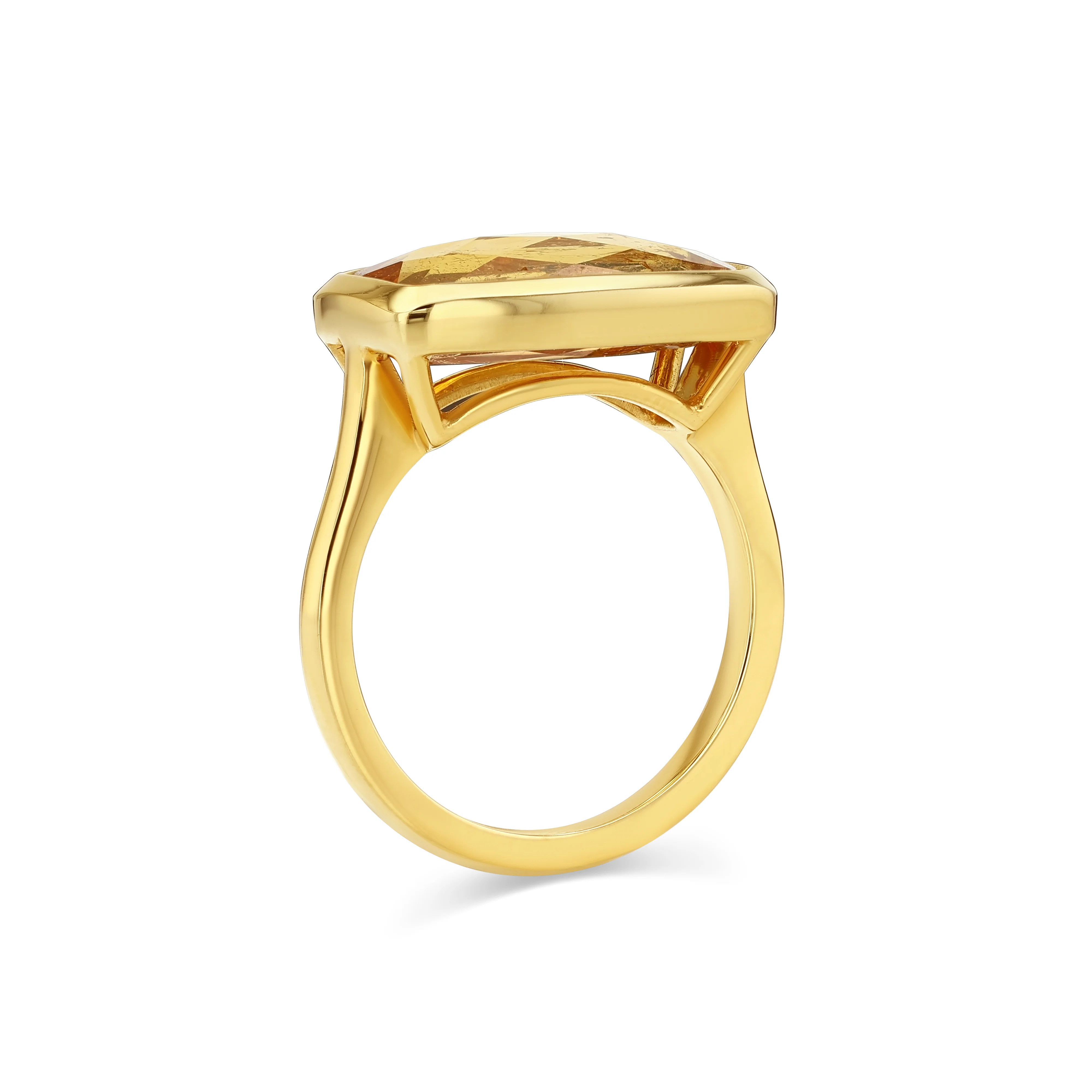 The one-of-a-kind Imperial Topaz Ring features a glowing 5.79ct elongated cushion-cut imperial topaz, bezel set in warm 14k yellow gold. The gemās rich golden-orange hue evokes the radiant glow of a late summer sunsetārare, luminous, and full of warmth.