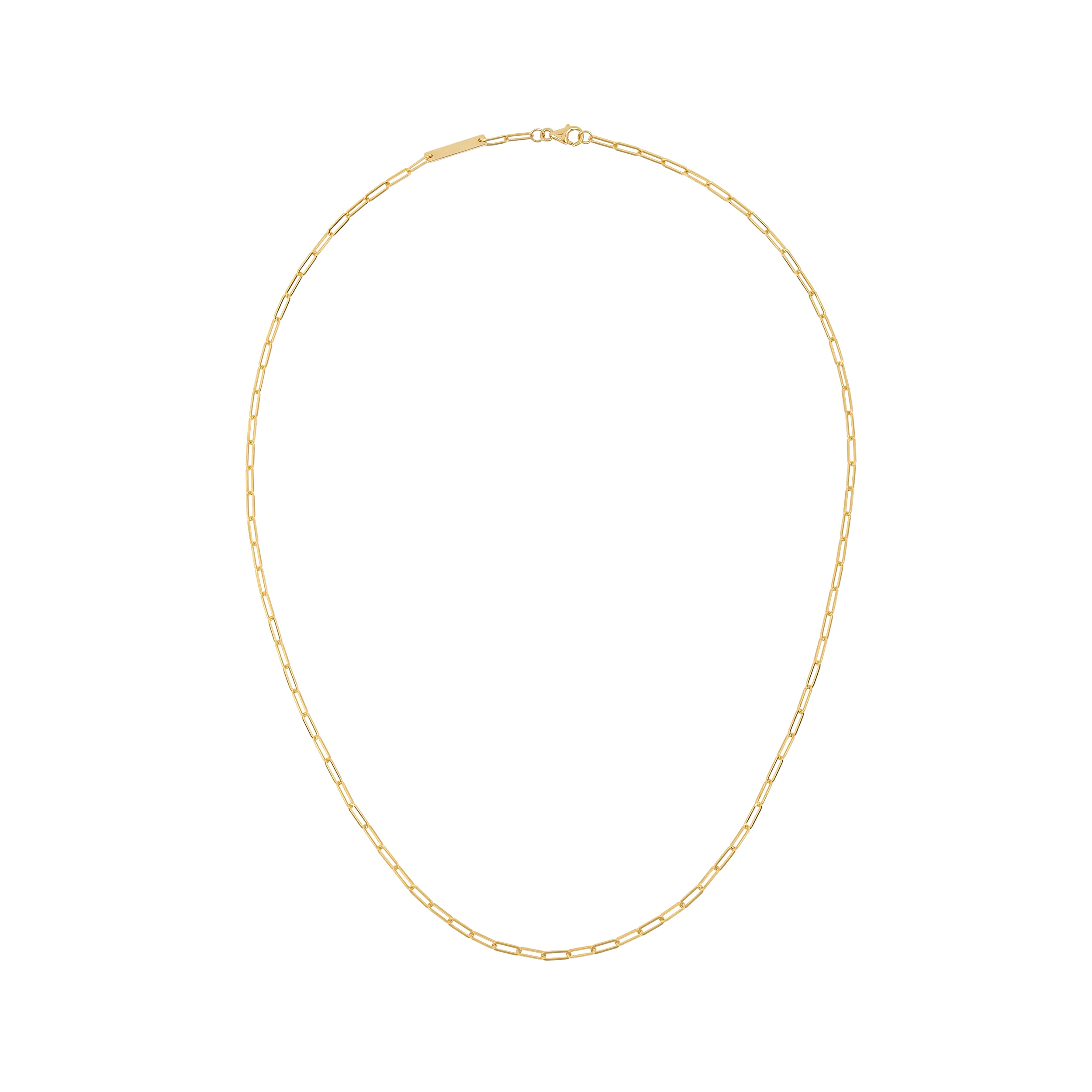 A delicate open link chain, that is sweet on its own but sturdy enough for a few charms. The open links make it adjustable, but we like to wear it long!